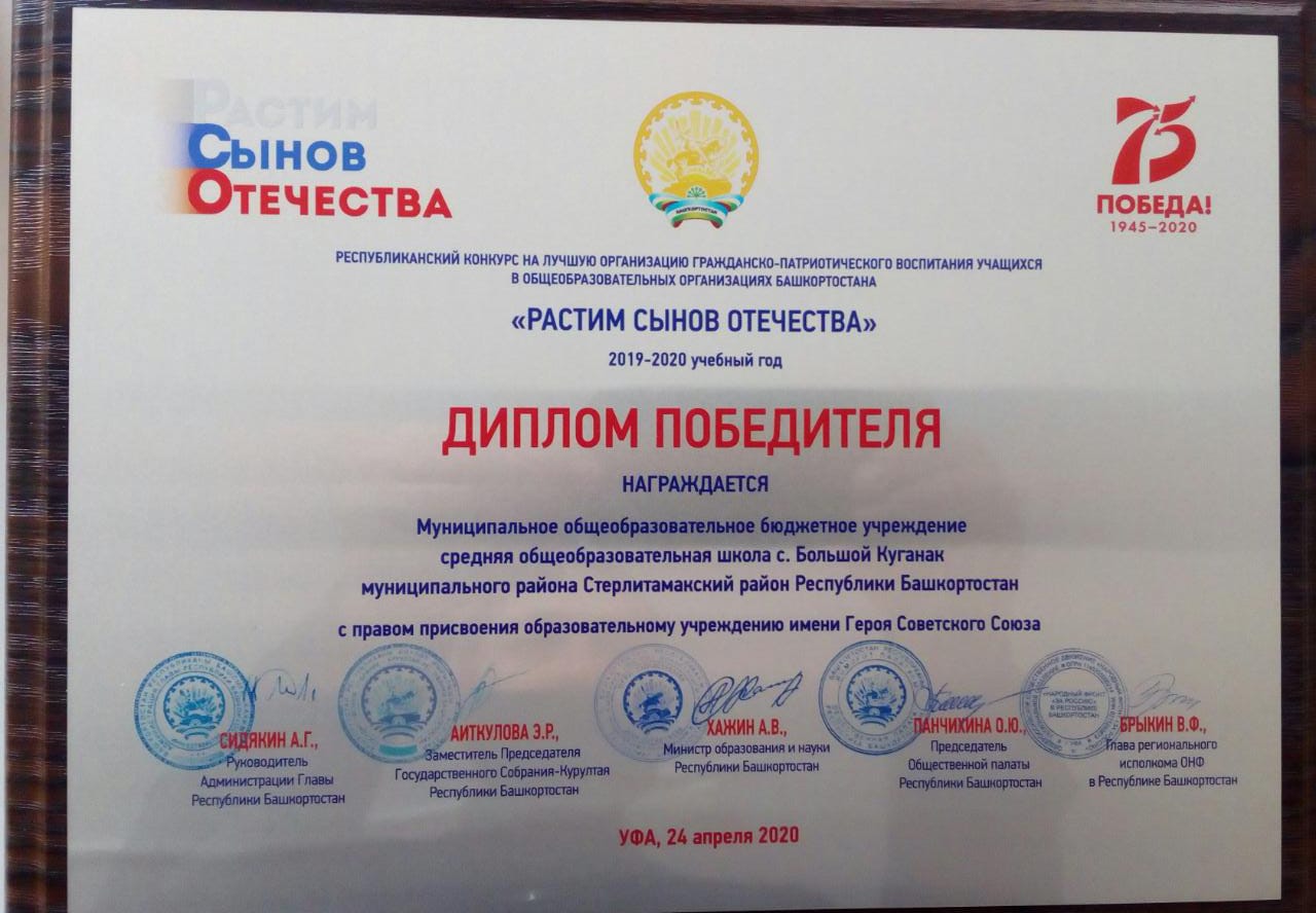 В 2019- 2020 учебном году наша школа приняла участие в Республиканском конкурсе гражданско- патриотического воспитания учащихся в общеобразовательных организациях Башкортостана "РАСТИМ СЫНОВ ОТЕЧЕСТВА". Конкурс проводился под патронатом Главы Республики Башкортостан Р.Ф. Хабирова и Правительства Республики Башкортостан, приурочен 75-ой годовщине Победы в Великой Отечественной войне 1941-1945 годов. Всего в данном конкурсе приняло участие 214 образовательных учреждений, 35 из них удостоены высокого звания - Диплома победителя с правом присвоения образовательной организации имени Героя Советского Союза. В числе школ победителей и наша школа. Данная победа - результат планомерной работы всего педагогического коллектива школы над системой гражданско- патриотического воспитания. На конкурс были представлены Концепция гражданско- патриотического воспитания в МОБУ СОШ с.Большой Куганак и фото- приложение традиционных мероприятий, семинаров, акций, родительских собраний проводимых в нашей школе. Поздравляем коллектив МОБУ СОШ с.Большой Куганак с победой в конкурсе, желаем успехов и новых достижений.